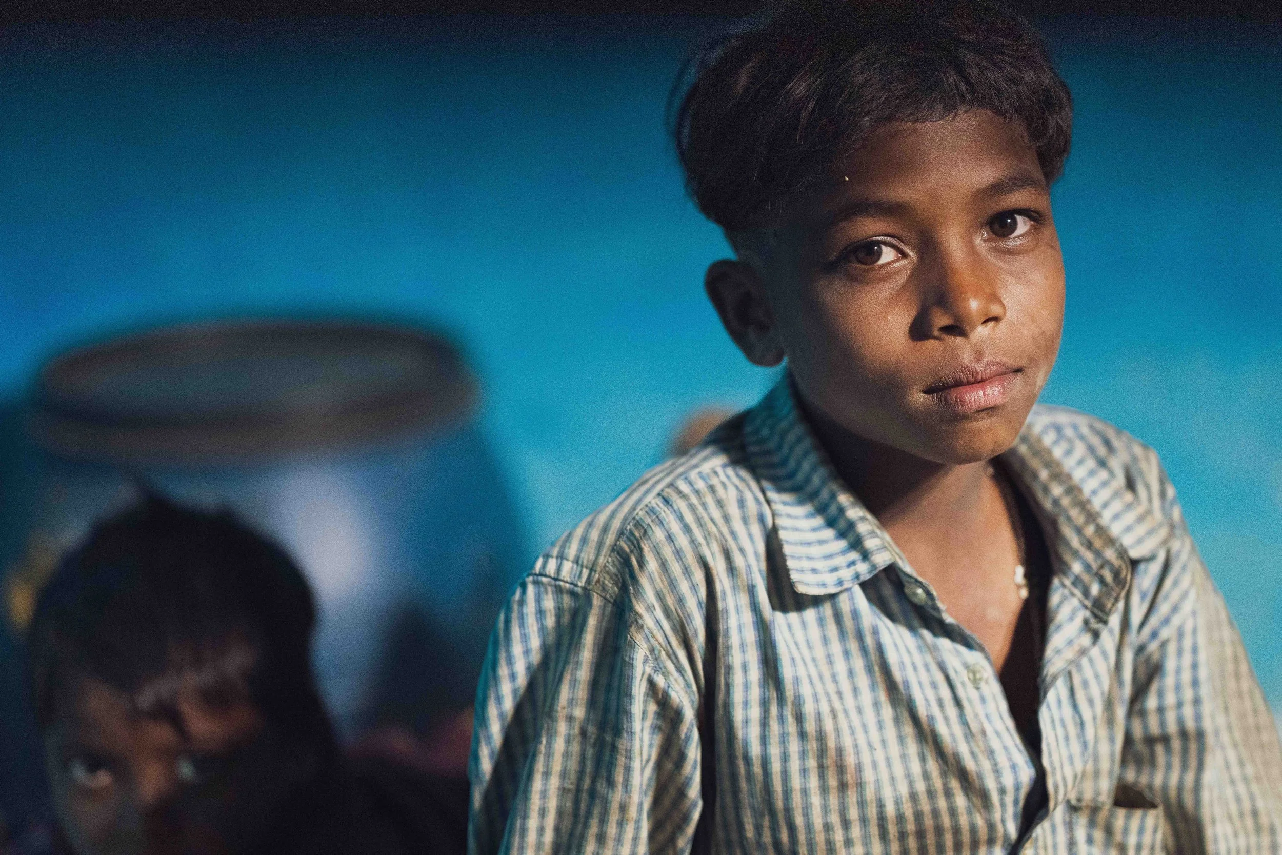 This young boy, with an air of melancholy about him, posed in the family bedroom as his younger brother looked on. His multi-generational family home was in a small village in Central India.