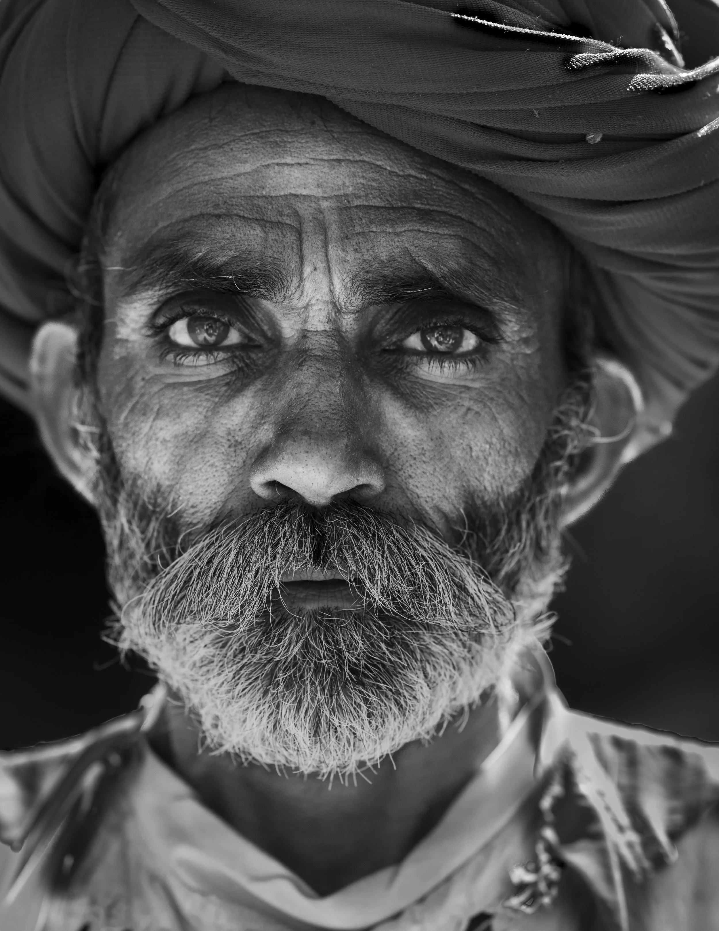 Although I took this photo of a Rabari goat herder in color, highlighting his bright red turban, I changed it to black and white so the focus is his arresting gaze. I captured this picture in a small town near Jawai, Rajasthan when he stepped on a white floor offering the beautiful reflected uplight.