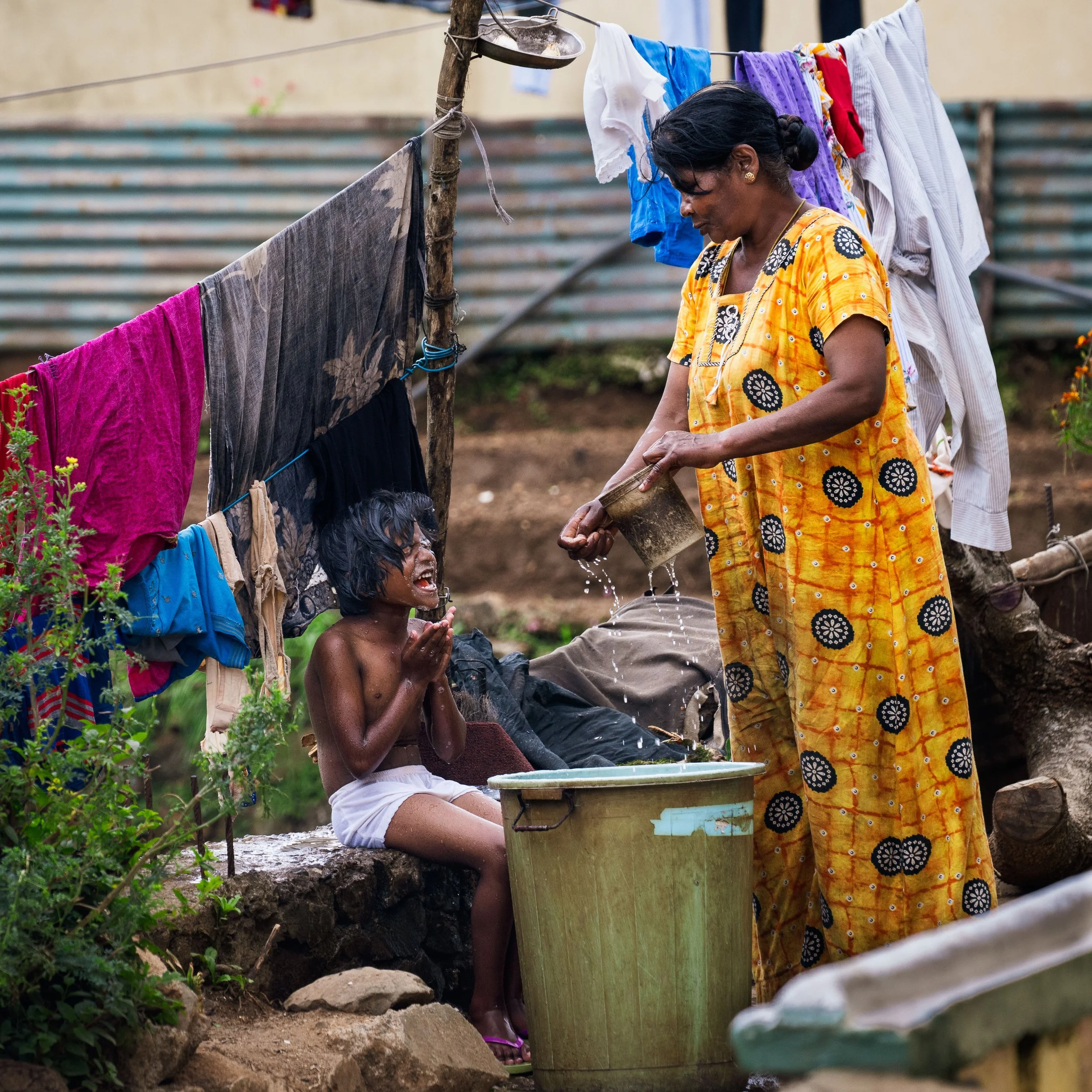 With no running water at home, this boy is bathing outdoors. I wanted to capture his adorable, and universal, reaction to having cold water poured over his head.