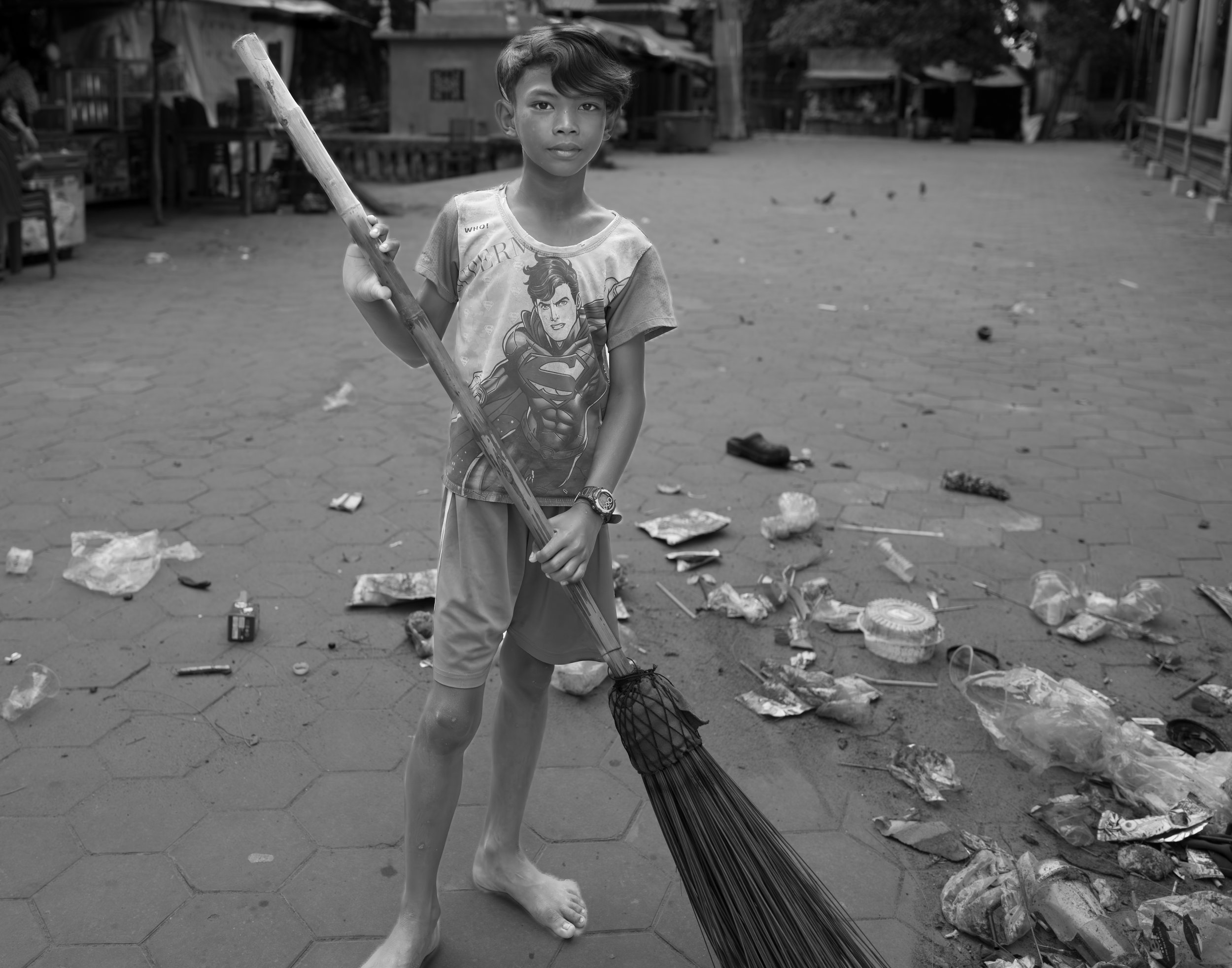 Beautiful boy cleaning trash near the pagoda,Tonle Lake floating village, Cambodia